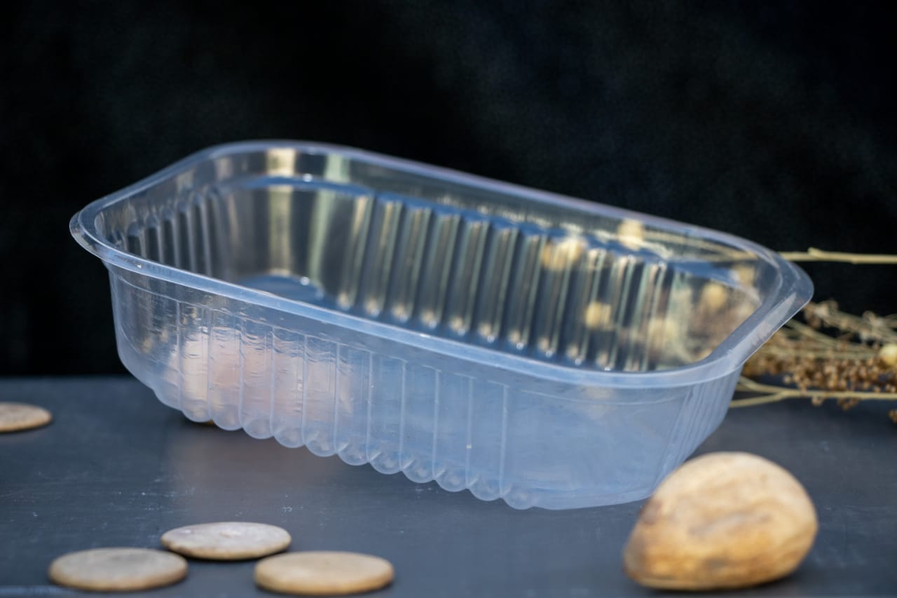 Bandeja plástica apta para productos calientes.